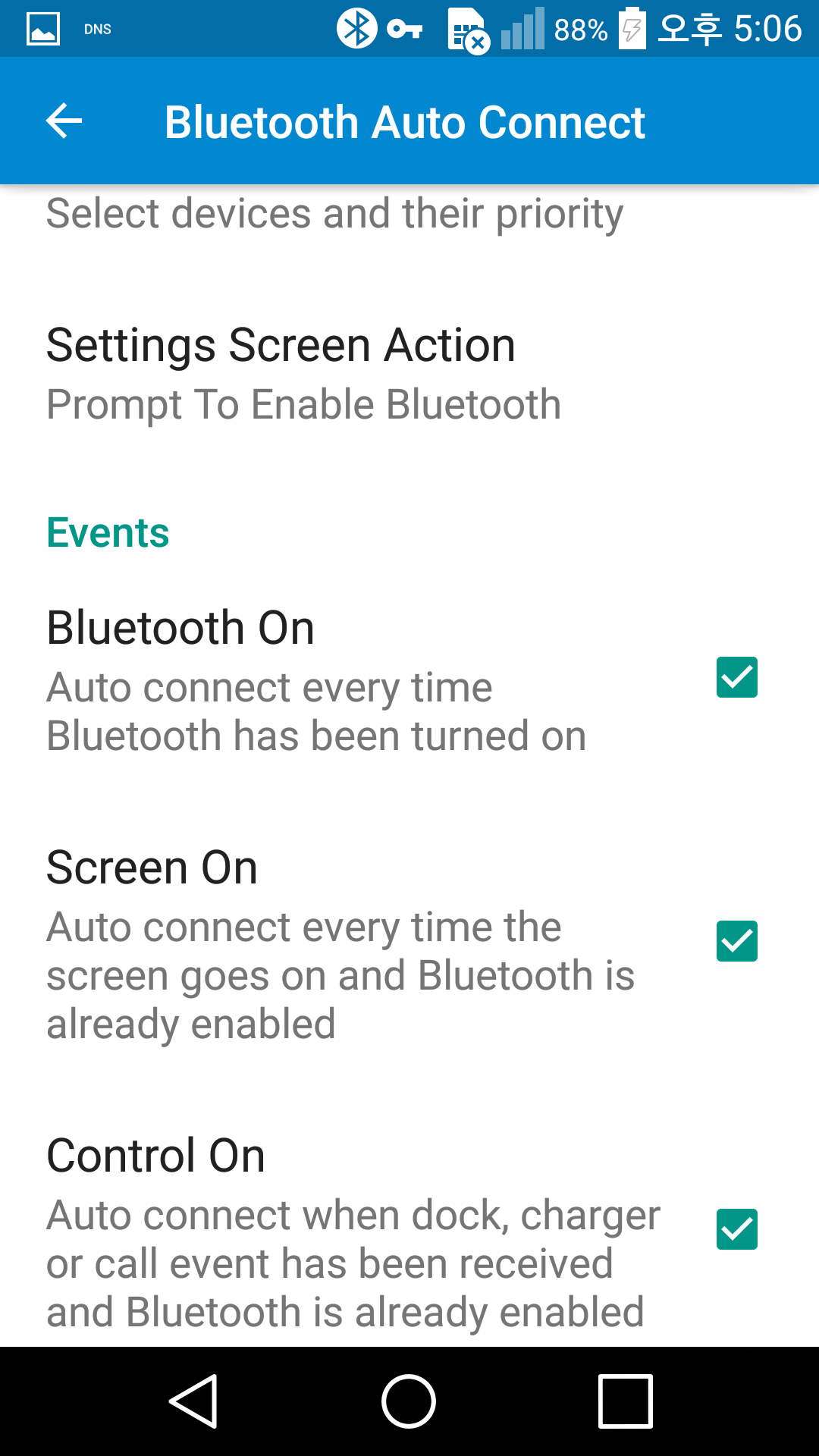 이제 ‘Profiles’를 눌러서 Networking(PAN)을 선택한다. 그리고 마지막으로 ‘Events’ 항목에서 Bluetooth On, Screen On, Control On을 모두 선택한다.