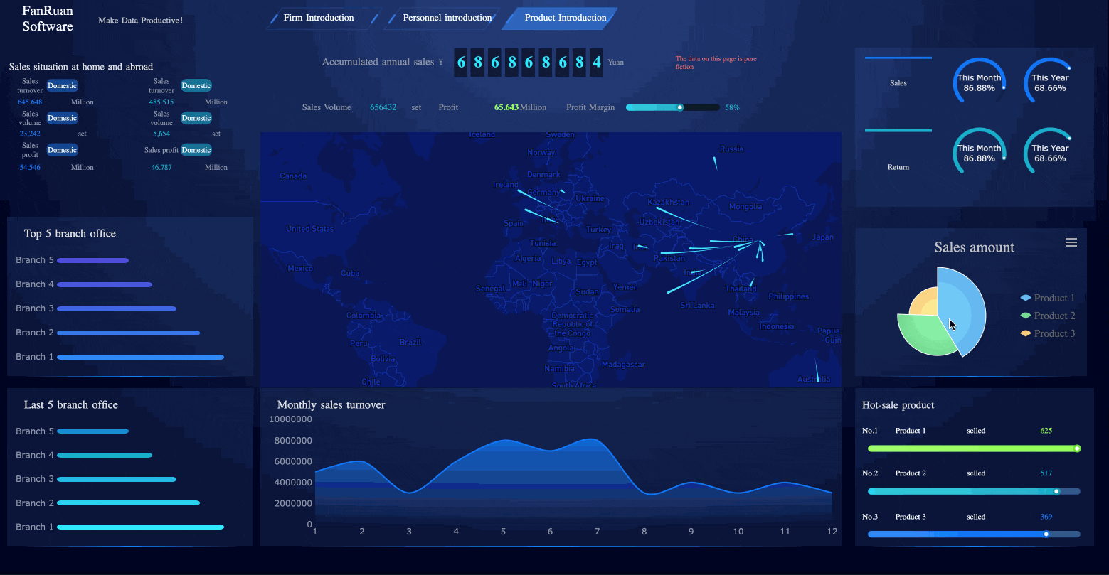 파인리포트는 다양한 최신 시각화 대시보드 차트가 내장된 툴입니다. 디자인 기본값은 어두운 배경과 형광색 전경입니다. 엑셀과 유사한 인터페이스에서 드래그 앤 드롭만으로 직접 대시보드 디자인 완성할 수 있습니다. 다양한 시나리오의 비즈니스 요구에 적용가능한 ‘carousel’ 나 ‘refresh’ 애니메이션을 제공합니다.