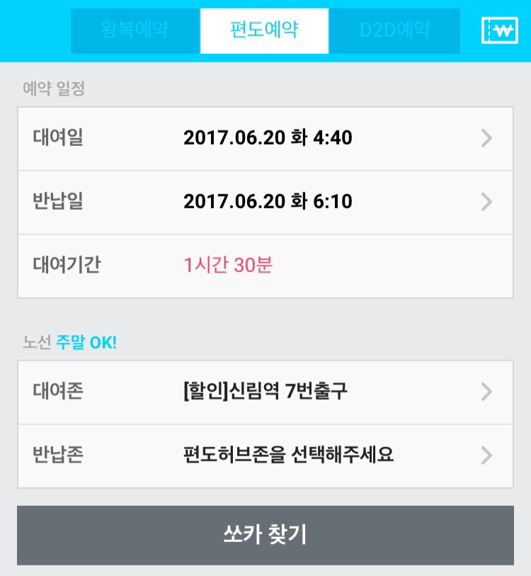 예약에 들어간 후 위쪽 상단에 있는 "편도예약" 버튼을 누른 다음 사용을 원하는 시간을 입력!