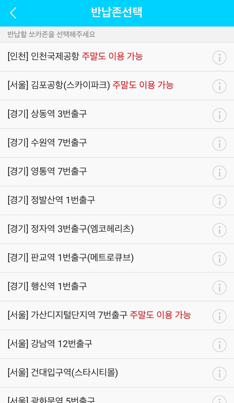 그리고 반납존을 클릭한 후에 상당에 위치한 인천공항을 선택해줍니다!(김포공항도 가능)